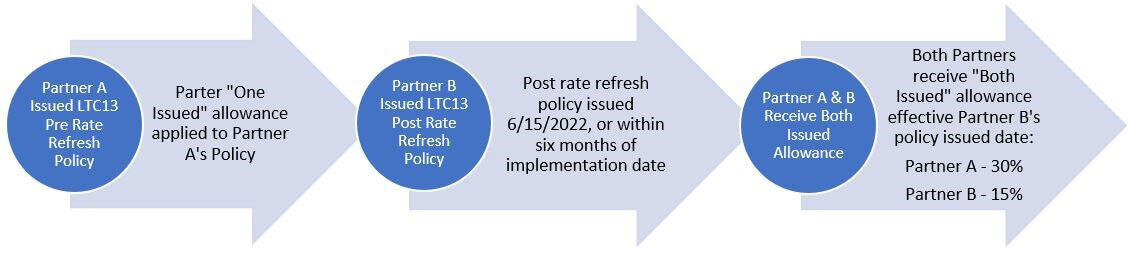 - Partner A’s policy will receive the 30% old “Partner – Both Issued” allowance effective Partner B’s issued date