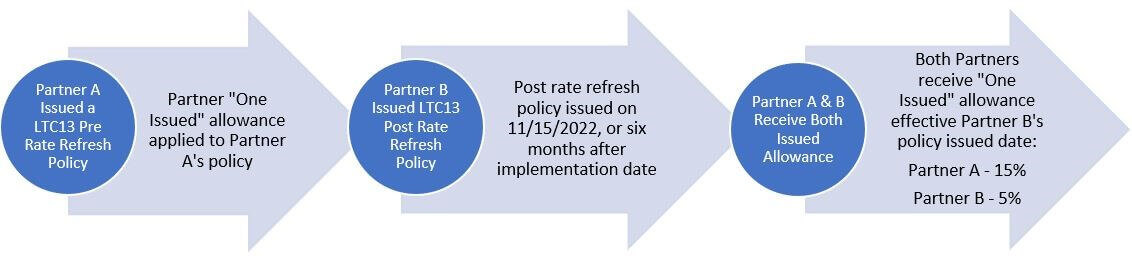 - Partner A is issued a policy with old rates and would receive the 15% “Partner – One Issued” allowance